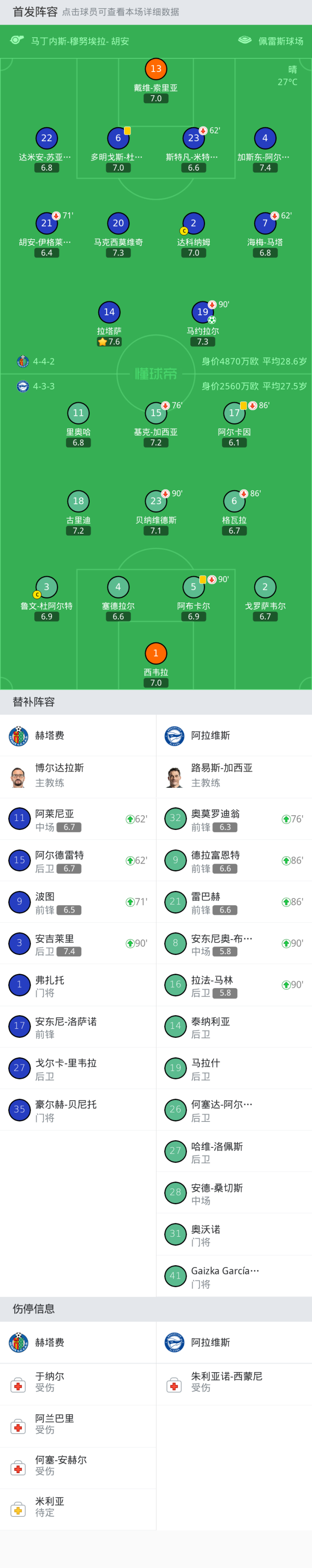 赫塔费首发:达米安-苏亚雷斯, 斯特凡-米特罗维奇, 海梅-马塔, 达科纳姆, 马克西莫维奇, 戴维-索里亚, 多明戈斯-杜阿尔特, 马约拉尔, 胡安-伊格莱西亚斯, 拉塔萨, 加斯东-阿尔瓦雷斯