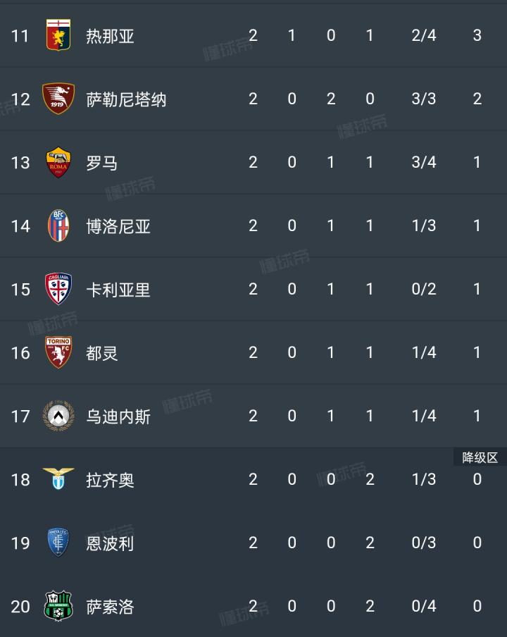 意甲新赛季第二轮凌晨全部结束,随着乌迪内斯作客战平萨勒尼塔纳拿到一分,拉齐奥进入了降级区。