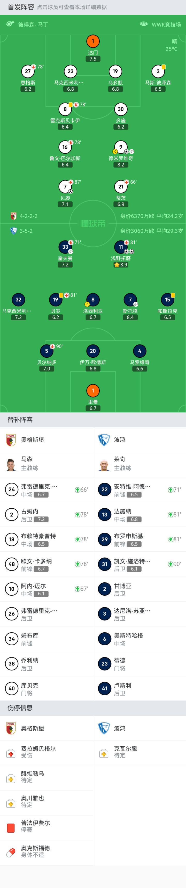 奥格斯堡首发:马斯-彼泽森, 雷克斯贝卡伊, 乌多凯, 蒂茨, 达门, 多施, 德米罗维奇, 鲁文-巴尔加斯, 马克西米利安-鲍尔, 贝廖, 恩格斯