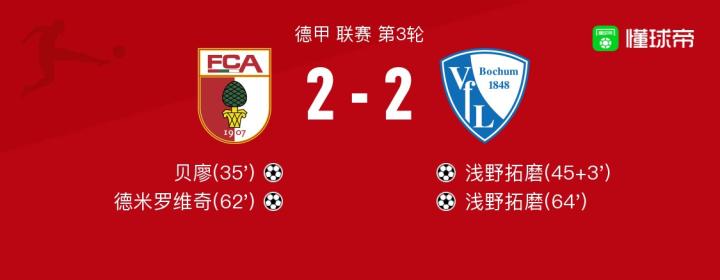 北京时间9月02日德甲 联赛 第3轮,奥格斯堡主场对阵波鸿。奥格斯堡贝廖破门,德米罗维奇破门。波鸿浅野拓磨梅开二度。最终比分2-2。