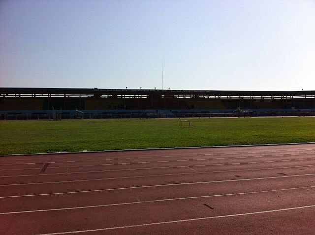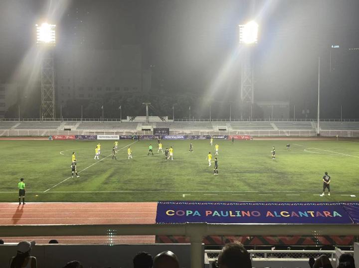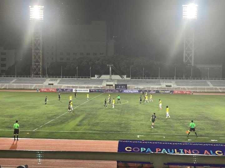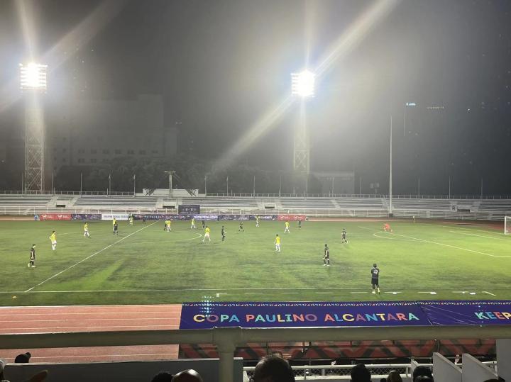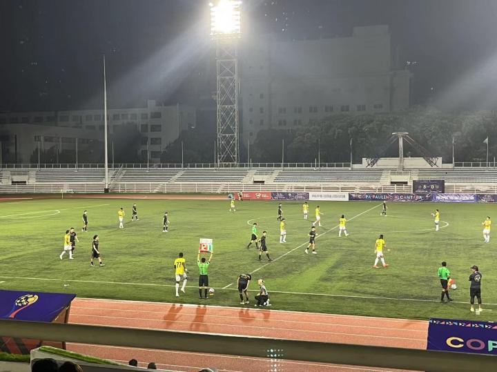 9月3日晚八点在黎刹纪念体育场进行的是菲律宾杯A组卡雅FC与CF马尼拉队之间的比赛,卡雅FC前三轮全胜进27球失1球。而CF马尼拉队是由去年还在参加菲律宾联赛本赛季退赛的ADT队的班底组成,小组赛前四场三胜一平,本场比赛算是本组头名之争。山东泰山俱乐部几位来到马尼拉进行客场赛前考察的工作人员本场也来到现场考察对手。比赛免费入场,也没有安检,有顶棚的这面看台上稀稀拉拉的坐了几百人,大部分是菲律宾足球圈内人士和与球队相关的人员,刚踢完上一场比赛的球员就在看台上一边吃炸鸡一边看比赛。