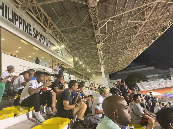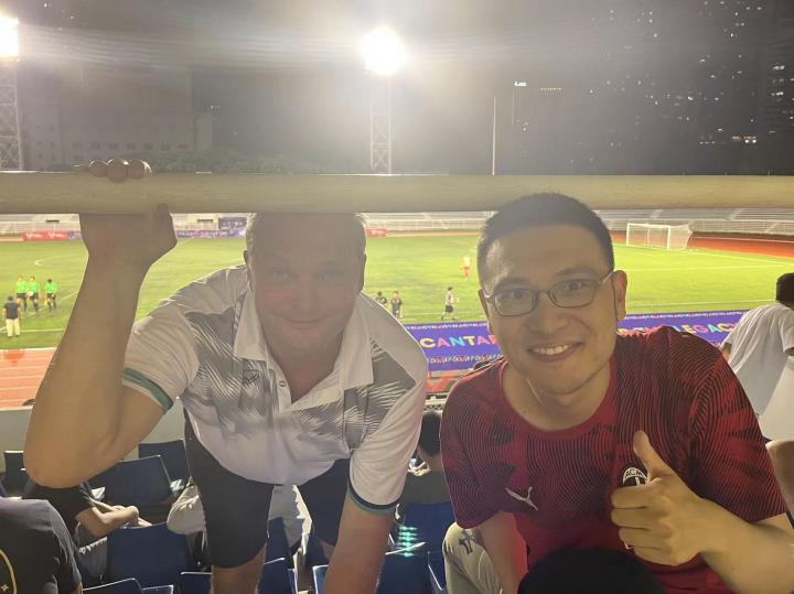 菲律宾国家队今年6月新上任的主教练迈克尔魏斯也在看台上观战,我还和他合了个影。这是他第二次执教菲律宾国家队,上一次是2011-14年,后来又去了蒙古(2017-2020)和老挝国家队(2022-23)执教。2004-2006年他曾在克劳琛执教的中国85国青队担任助理教练。
