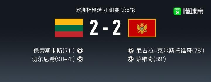 北京时间9月08日欧洲杯预选 小组赛 第5轮,立陶宛主场对阵黑山。立陶宛保劳斯卡斯破门,切尔尼希破门。黑山尼古拉-克尔斯托维奇破门,萨维奇破门。最终比分2-2。