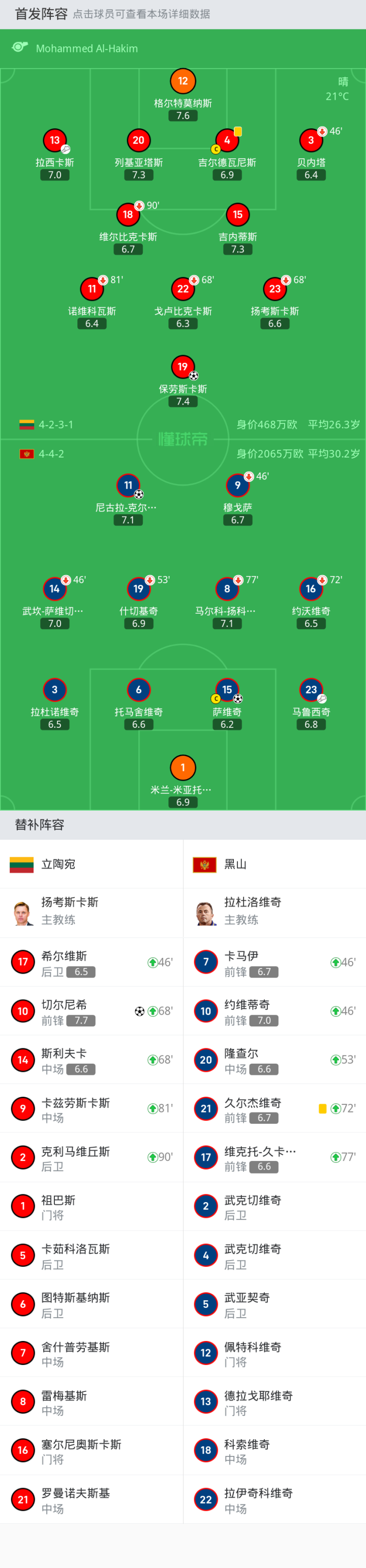 黑山首发:6-托马舍维奇, 15-萨维奇, 19-什切基奇, 1-米兰-米亚托维奇, 9-穆戈萨, 3-拉杜诺维奇, 8-马尔科-扬科维奇, 16-约沃维奇, 14-武坎-萨维切维奇, 23-马鲁西奇, 11-尼古拉-克尔斯托维奇