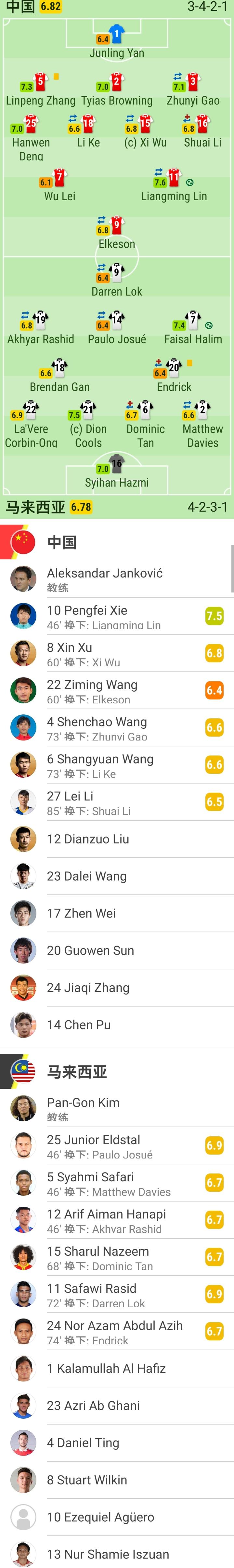 马来西亚首发:16-西汉-哈兹米、22-科尔班-王、21-迪昂-古斯、2-马修-戴维斯(46'5-斯亚赫米-萨法里)、18-颜兴龙、6-陈俊仁(68'15-沙鲁-钠兹姆)、14-保罗-乔苏(46'25-小埃尔德斯达)、7-法塞尔-哈利姆、9-陆伊腾(72'11-萨法维-拉希德)、19-阿克亚-拉希德(46'12-阿里夫-艾曼)、20-恩德里克-多斯-桑托斯(74'24-阿扎姆-阿齐)