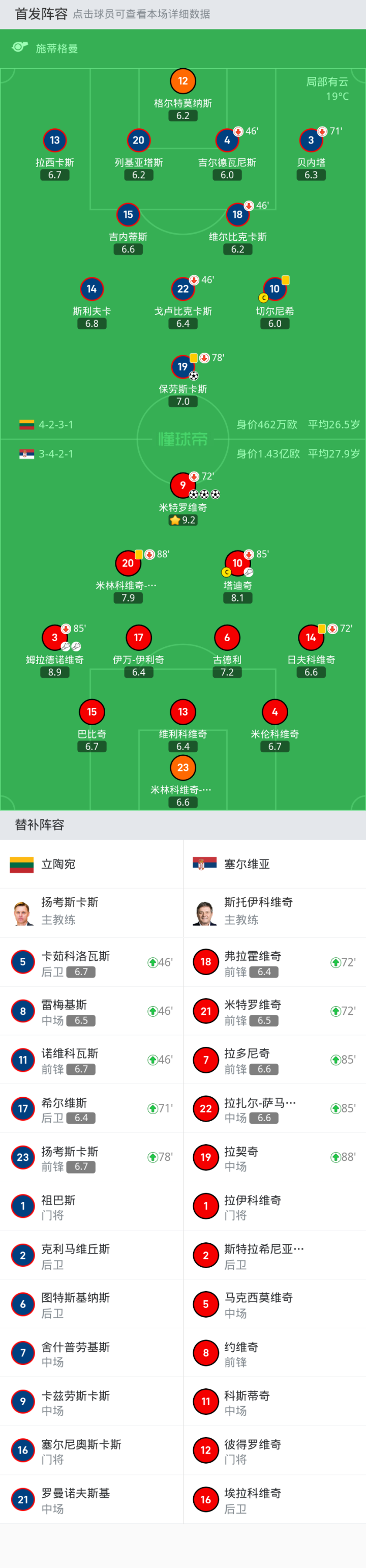 上场替补:85'7-拉多尼奇, 72'18-弗拉霍维奇, 88'19-拉契奇, 85'22-拉扎尔-萨马尔季奇, 72'21-米特罗维奇
