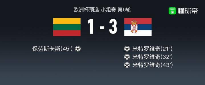 北京时间9月11日欧洲杯预选 小组赛 第6轮,立陶宛主场对阵塞尔维亚。立陶宛保劳斯卡斯破门。塞尔维亚米特罗维奇帽子戏法。最终比分1-3。
