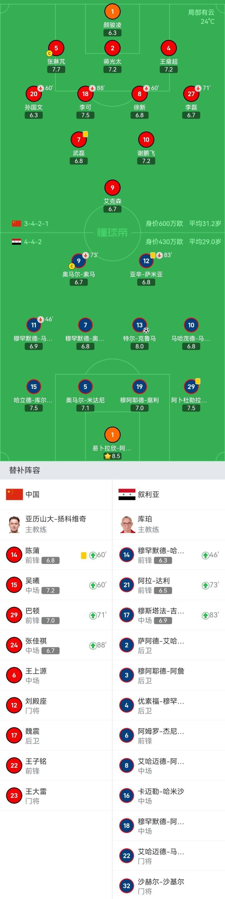 叙利亚首发:1-易卜拉欣-阿勒马、15-哈立德-库尔达格利、19-穆阿耶德-扈利、29-阿卜杜勒拉赫曼-韦斯、5-奥马尔-米达尼、7-穆罕默德-奥斯曼、11-穆罕默德-马尔穆尔(46'14-穆罕默德-哈拉克)、12-亚辛-萨米亚(83'17-穆斯塔法-吉内德)、13-特尔-克鲁马、9-奥马尔-索马(73'21-阿拉-达利)、10-马哈茂德-马瓦斯