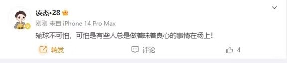 凌杰发文表示:输球不可怕,可怕的是有些人总是做着昧着良心的事情在场上!在评论区球迷提醒后,凌杰删除了该条微博。