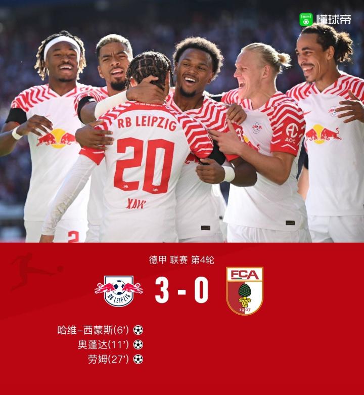 北京时间9月16日21:30德甲联赛 第4轮,RB莱比锡主场对阵奥格斯堡。RB莱比锡哈维-西蒙斯开场6分钟破门,随后哈维-西蒙斯助攻奥蓬达破门,劳姆小角度破门。最终比分3-0。