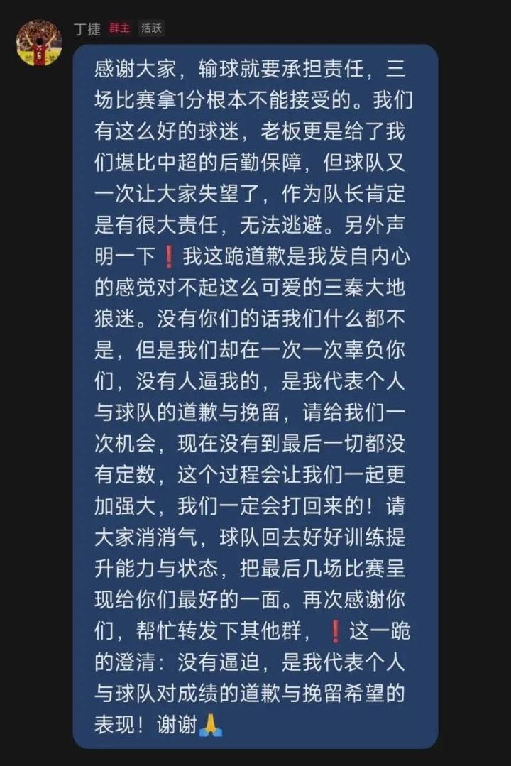 赛后有声音称,丁捷是被球迷要求下跪的。而丁捷在自己的球迷群里回应道:“作为队长肯定是有很大责任,无法逃避,我下跪道歉是我发自内心的感觉,对不起这么可爱的三秦大地狼迷。没有你们的话,我们什么都不是,但是我们却在一次一次辜负你们……没有逼迫,是我代表个人与球队,对成绩的道歉,与挽留希望的表现。”