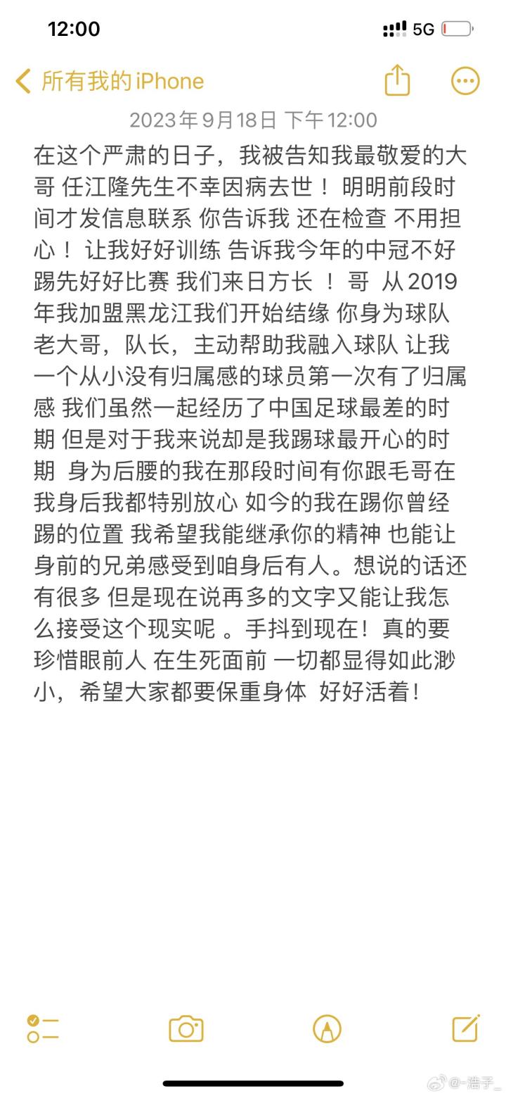 张浩在社媒写道:“如今的我踢你曾经踢的位置,穿你曾经穿的号码,我也要继承你曾经的精神!定格在35岁,两个儿子的父亲,还有很多事没做,所有人都不愿、不敢去接受这个事实,我们曾经的、现在的战友,我们的兄弟。一个鞠躬尽瘁的足球人,一个任劳任怨的队长,一个好人。愿天堂没有病痛,没有这人间疾苦,一路走好。”