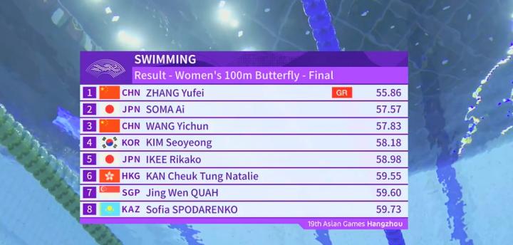 此前的赛会纪录是张雨霏在今天稍早时间100米蝶泳预赛游出的56秒20,今晚张雨霏再度改写纪录,并帮助中国游泳队拿下中国游泳队杭州亚运会第16金。