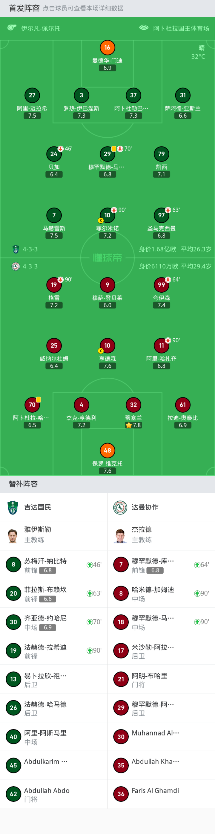 吉达国民首发:10-菲尔米诺, 7-马赫雷斯, 16-爱德华-门迪, 97-圣马克西曼, 79-凯西, 3-罗热-伊巴涅斯, 29-穆罕默德-马吉哈德, 27-阿里-迈拉希, 37-阿卜杜勒巴西特-欣迪, 24-贝加, 31-萨阿德-亚斯兰