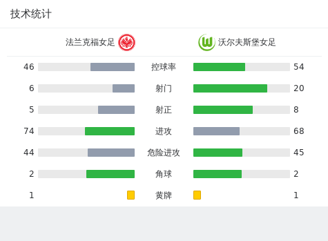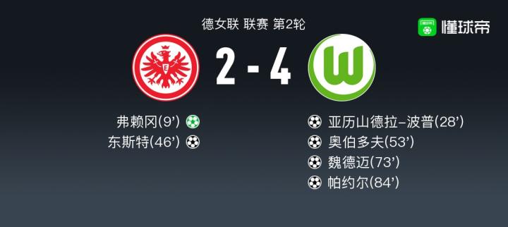 北京时间10月01日德女联 联赛 第2轮,法兰克福女足主场对阵沃尔夫斯堡女足。法兰克福女足弗赖冈破门,东斯特破门。沃尔夫斯堡女足亚历山德拉-波普破门,奥伯多夫破门,魏德迈破门,帕约尔破门。最终比分2-4。