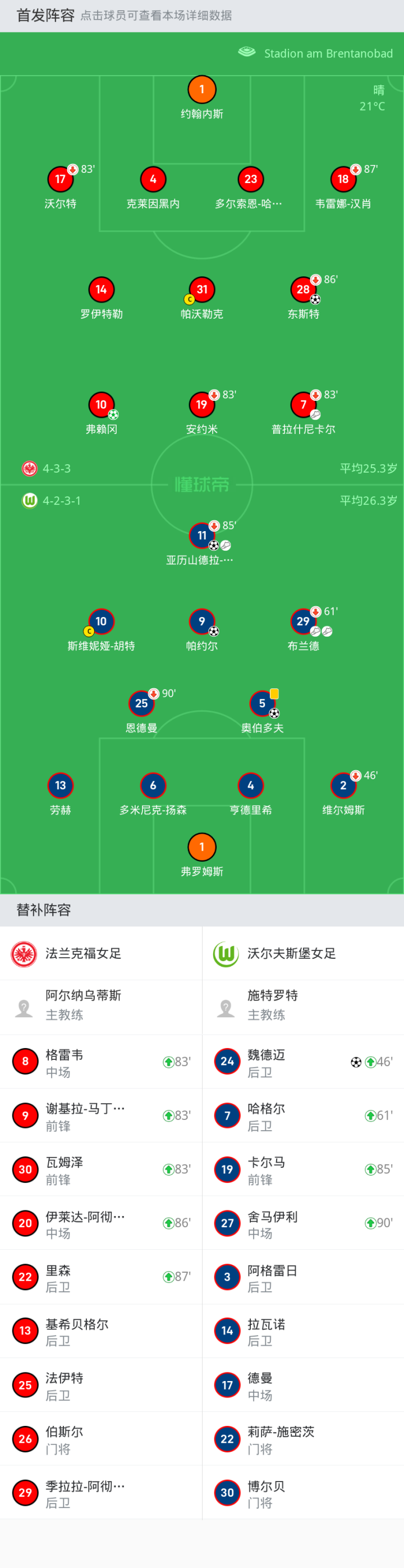 法兰克福女足首发:23-多尔索恩-哈杰赫, 18-韦雷娜-汉肖, 28-东斯特, 7-普拉什尼卡尔, 14-罗伊特勒, 10-弗赖冈, 17-沃尔特, 31-帕沃勒克, 4-克莱因黑内, 1-约翰内斯, 19-安约米