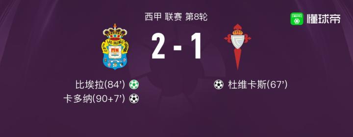北京时间10月03日西甲 联赛 第8轮,拉斯帕尔马斯主场对阵塞尔塔。拉斯帕尔马斯比埃拉破门,卡多纳破门。塞尔塔杜维卡斯破门。最终比分2-1。