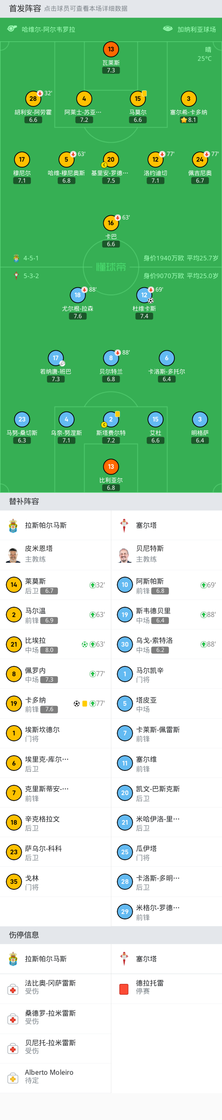 塞尔塔首发:17-若纳唐-班巴, 13-比利亚尔, 2-斯塔费尔特, 4-乌奈-努涅斯, 15-艾杜, 8-贝尔特兰, 18-尤尔根-拉森, 12-杜维卡斯, 3-明格萨, 23-马努-桑切斯, 6-卡洛斯-多托尔