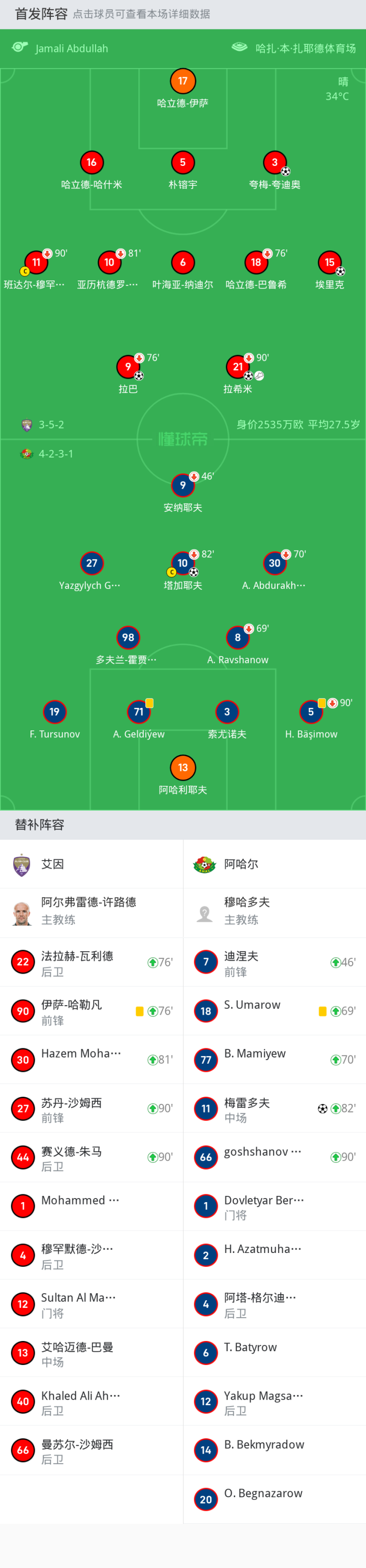 艾因首发:17-哈立德-伊萨, 11-班达尔-穆罕默德, 10-亚历杭德罗-罗梅罗, 9-拉巴, 5-朴镕宇, 16-哈立德-哈什米, 18-哈立德-巴鲁希, 21-拉希米, 6-叶海亚-纳迪尔, 15-埃里克, 3-夸梅-夸迪奥