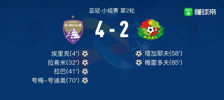 北京时间10月04日亚冠 小组赛 第2轮,艾因主场对阵阿哈尔。艾因埃里克破门,拉希米破门,拉巴破门,夸梅-夸迪奥破门。阿哈尔塔加耶夫破门,梅雷多夫破门。最终比分4-2。