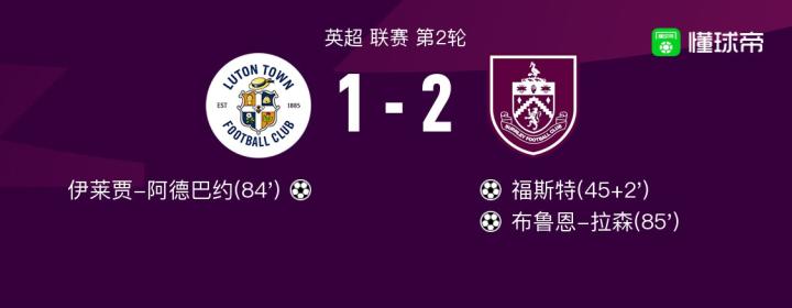 北京时间10月04日英超 联赛 第2轮,卢顿主场对阵伯恩利。此役,福斯特单刀首开记录,伊莱贾-阿德巴约低射扳平,布鲁恩-拉森内切世界波绝杀。最终,伯恩利客场2-1击败卢顿,迎联赛首胜。