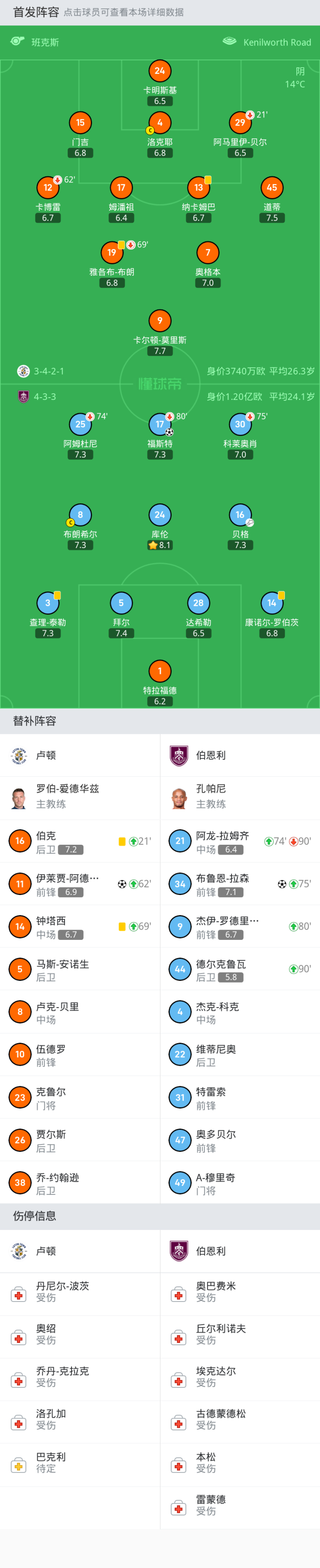 伯恩利首发:3-查理-泰勒, 8-布朗希尔, 16-贝格, 24-库伦, 14-康诺尔-罗伯茨, 17-福斯特, 5-拜尔, 1-特拉福德, 28-达希勒, 25-阿姆杜尼, 30-科莱奥肖
