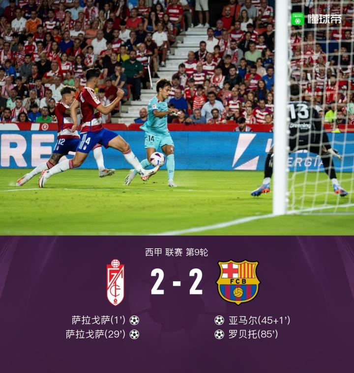 北京时间10月09日西甲 联赛 第9轮,格拉纳达主场对阵巴塞罗那。上半场萨拉戈萨梅开二度,孔德伤退,亚马尔扳回一球,下半场罗贝托破门,菲利克斯进球被吹。最终两队2-2战平。
