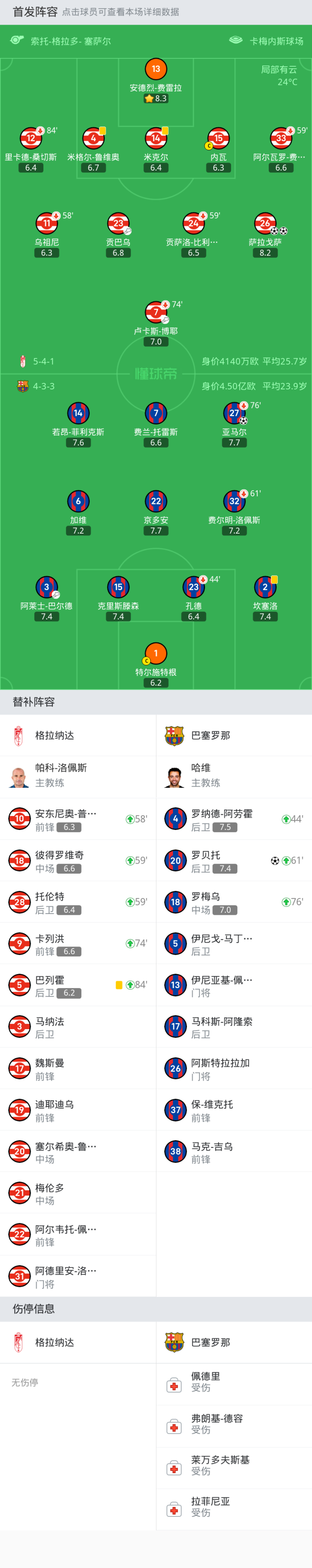 格拉纳达首发:14-米克尔, 23-贡巴乌, 13-安德烈-费雷拉, 11-乌祖尼, 7-卢卡斯-博耶, 24-贡萨洛-比利亚尔, 15-内瓦, 4-米格尔-鲁维奥, 12-里卡德-桑切斯, 26-萨拉戈萨, 33-阿尔瓦罗-费尔南德斯