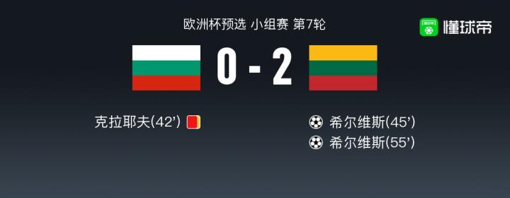 北京时间10月15日欧洲杯预选 小组赛 第7轮,保加利亚主场对阵立陶宛。立陶宛希尔维斯梅开二度。最终比分0-2。