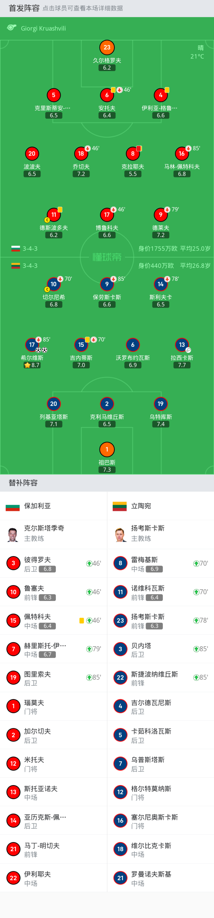 上场替补:85'19-图里索夫, 46'10-鲁塞夫, 46'3-彼得罗夫, 46'15-佩特科夫, 79'7-赫里斯托-伊万诺夫