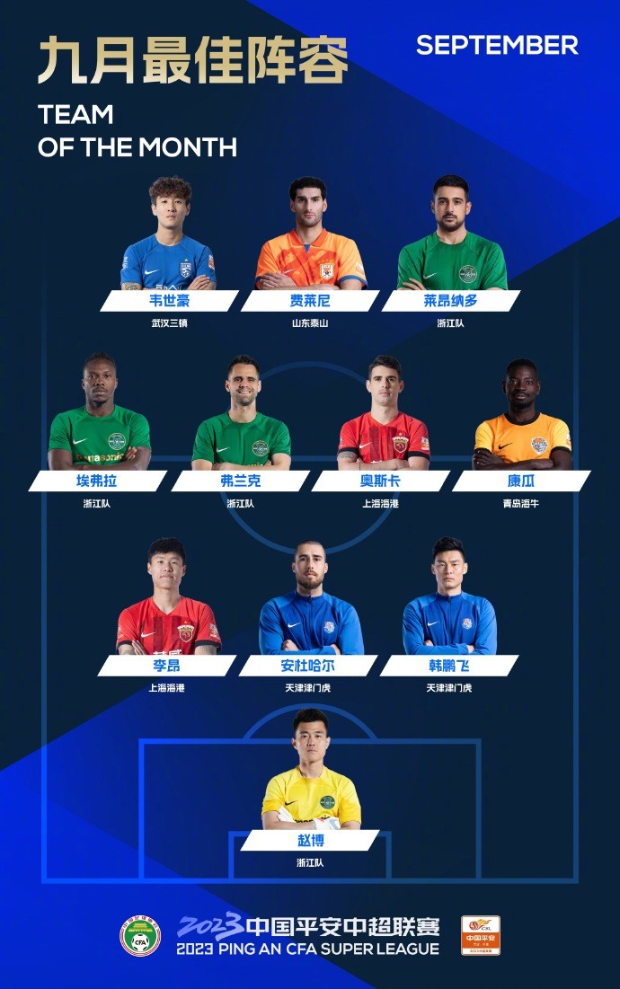 扫描下载懂球帝首页>动态> 中超9月最佳阵容:韦世豪、费莱尼领衔,浙江4人入选