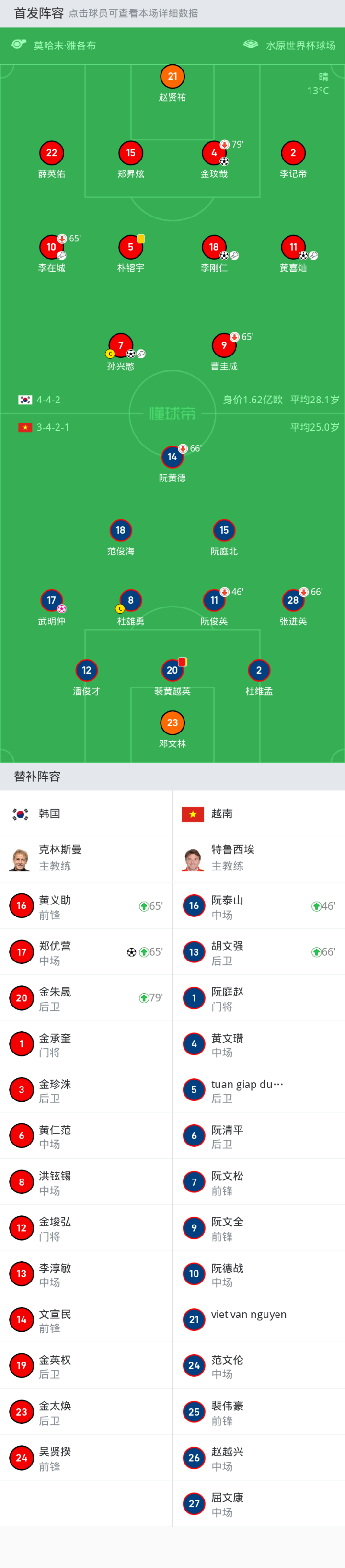 上场替补:65'16-黄义助, 65'17-郑优营, 79'20-金朱晟