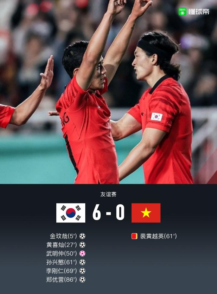 北京时间10月17日友谊赛,韩国主场对阵越南。上半场,金玟哉率先头球破门,李刚仁打门中柱,孙兴慜推射被精彩解围,李在城送出手术刀般直塞,黄喜灿推射破门;下半场,孙兴慜横传门前造成武明仲乌龙,孙兴慜与黄喜灿做出撞墙配合后破门,裴黄越英两黄变一红被罚下,孙兴慜助攻李刚仁破门,屈文康任意球中柱,邓文林被虚晃一枪后扑救不远,郑优营小角度补进。最终比分6-0。