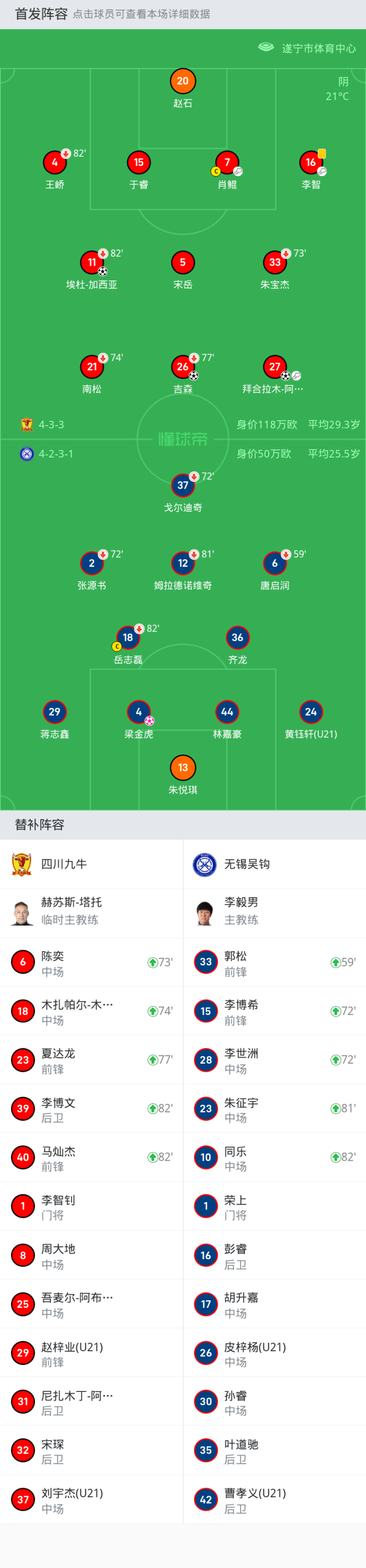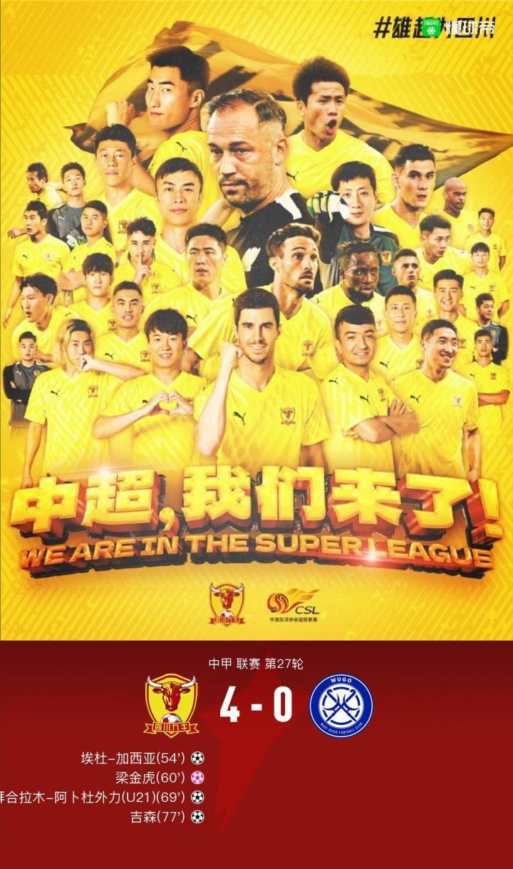 北京时间10月18日中甲联赛第27轮,四川九牛主场对阵无锡吴钩。比赛第54分钟,拜合拉木助攻,埃杜-加西亚头球破门,第60分钟,梁金虎不幸自摆乌龙,第69分钟,拜合拉木-阿卜杜外力小角度破门,第77分钟,吉森吊射破门。最终比分4-0。四川九牛提前3轮冲超成功,下赛季将与成都蓉城上演四川德比。