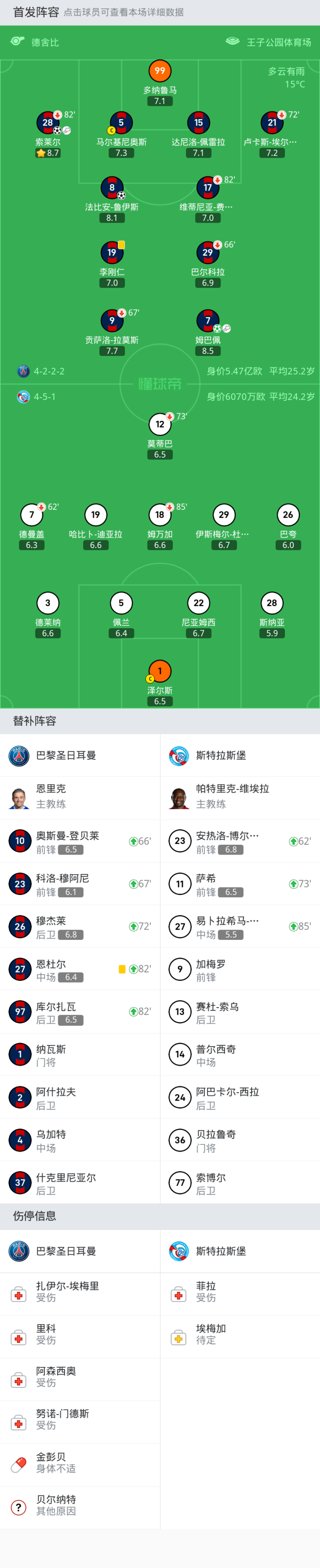 替换下场:72'21-卢卡斯-埃尔南德斯, 82'28-索莱尔, 82'17-维蒂尼亚-费雷拉, 67'9-贡萨洛-拉莫斯, 66'29-巴尔科拉
