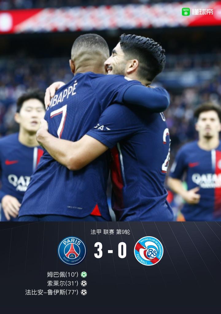 北京时间10月21日23:00,巴黎圣日耳曼在法甲联赛第9轮主场对阵斯特拉斯堡。上半场贡萨洛-拉莫斯制造点球机会,姆巴佩将点球罚进为巴黎圣日耳曼首开记录,紧接着莫蒂巴头球破门因越位在先被判无效,随后姆巴佩又助攻索莱尔轻松推射破门扩大比分。下半场法比安-鲁伊斯禁区内巧妙摆脱后再进一球锁定胜局,最终巴黎圣日耳曼主场3-0完胜斯特拉斯堡。