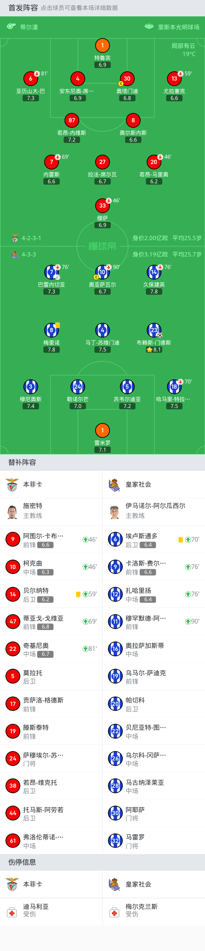 本菲卡首发:30-奥塔门迪, 20-若昂-马里奥, 8-奥尔斯内斯, 27-拉法-席尔瓦, 33-穆萨, 7-内雷斯, 6-亚历山大-巴, 1-特鲁宾, 13-尤拉塞克, 4-安东尼奥-席尔瓦, 87-若昂-内维斯