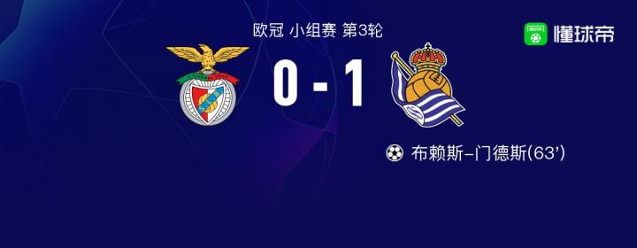 北京时间10月25日欧冠 小组赛 第3轮,本菲卡主场对阵皇家社会。本菲卡发动快攻,拉法-席尔瓦越位在先,穆萨的进球被取消。奥雅萨瓦尔的传球,门德斯的破门也是越位在先进球再次被取消,上半时双方互交白卷。易边再战,巴雷内切亚底线传球,门德斯推射破门打破了场上僵局。最终皇家社会凭借门德斯的破门客场1-0战胜本菲卡。