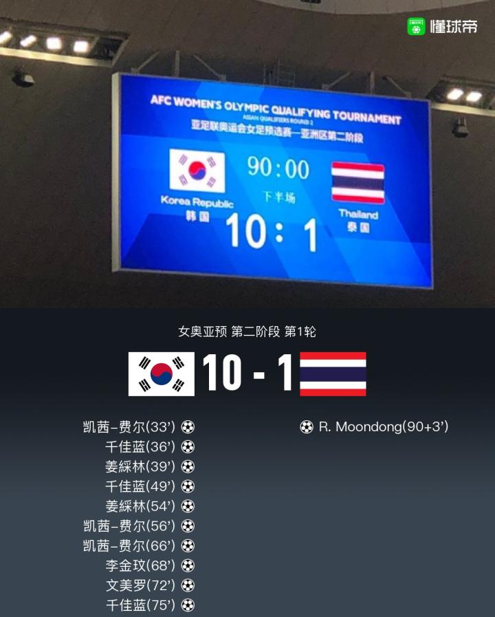 北京时间10月26日,女足奥预赛亚洲区第1轮的比赛中,韩国女足10-1狂胜泰国女足,收获开门红。其中,千佳蓝与混血球员凯茜-费尔上演了帽子戏法,姜綵林也上演了两射一传的好戏。11月1日,韩国女足将面对中国女足。