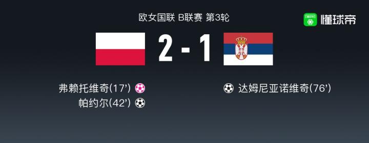 北京时间10月27日欧女国联 B联赛 第3轮,波兰女足主场对阵塞尔维亚女足。波兰女足帕约尔破门。塞尔维亚女足达姆尼亚诺维奇破门,弗赖托维奇自摆乌龙。最终比分2-1。