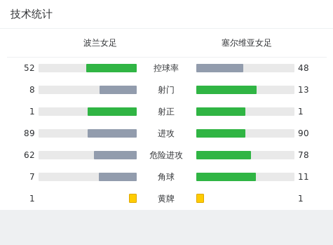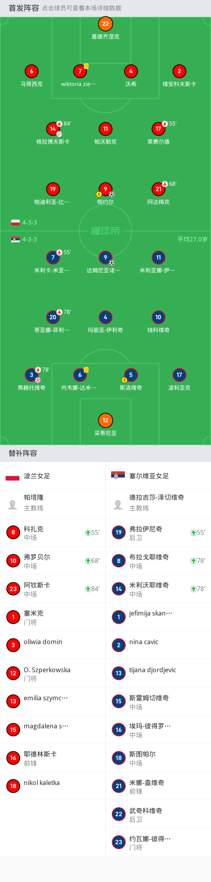 波兰女足首发:22-基德齐涅克, 9-帕约尔, 6-马蒂西克, 14-格拉博夫斯卡, 2-维安科夫斯卡, 11-帕沃勒克, 4-沃希, 17-莱费尔德, 21-阿达梅克, 7-wiktoria zieniewicz, 19-帕迪利亚-比达斯