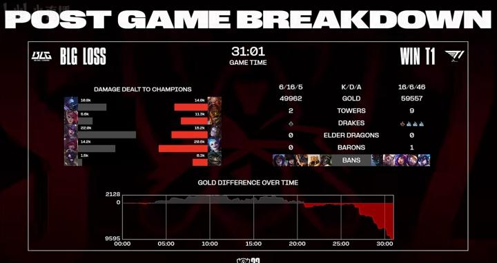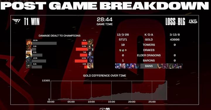 第28分钟,BLG中野阵亡,T1推平基地拿下首局。