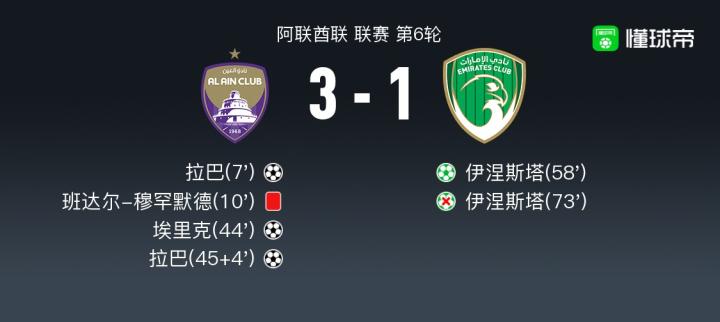 北京时间10月28日阿联酋联 联赛 第6轮,艾因主场对阵酋长。艾因拉巴梅开二度,埃里克破门。酋长伊涅斯塔破门。最终比分3-1。
