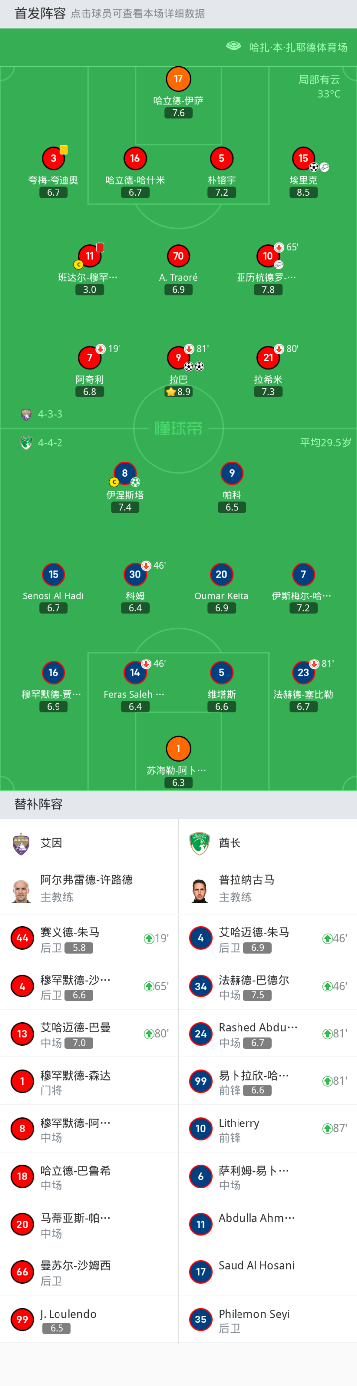 艾因首发:17-哈立德-伊萨, 11-班达尔-穆罕默德, 10-亚历杭德罗-罗梅罗, 7-阿奇利, 9-拉巴, 5-朴镕宇, 16-哈立德-哈什米, 21-拉希米, 15-埃里克, 3-夸梅-夸迪奥, 70-A. Traoré