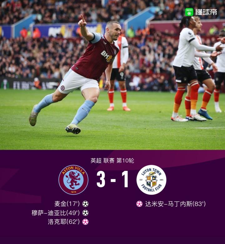 北京时间10月29日英超 联赛 第10轮,阿斯顿维拉主场对阵卢顿。上半场比赛第17分钟,战术定位球开出,麦金后点调整低射破门先拔头筹,下半场刚开始,穆萨-迪亚比在禁区内大力抽射破门将比分扩大,比赛第63分钟,穆萨-迪亚比前插进行压迫,皮球解围到门前,洛克耶不慎自摆乌龙,第83分钟,又一记乌龙,孔萨争高点头球回摆,皮球击中横梁下沿折射达米安-马丁内斯头部入网,随即全场战罢,最终比分3-1。