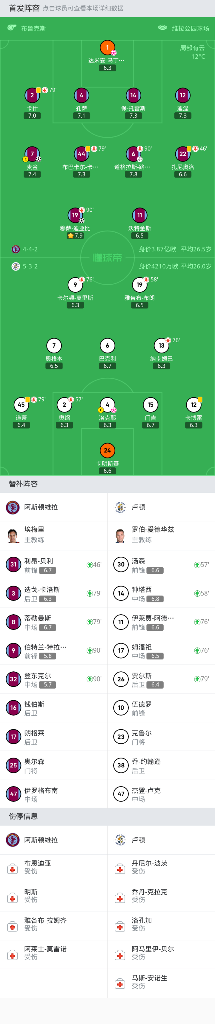 阿斯顿维拉首发:1-达米安-马丁内斯, 12-迪涅, 7-麦金, 11-沃特金斯, 14-保-托雷斯, 44-布巴卡尔-卡马拉, 4-孔萨, 2-卡什, 6-道格拉斯-路易斯, 22-扎尼奥洛, 19-穆萨-迪亚比