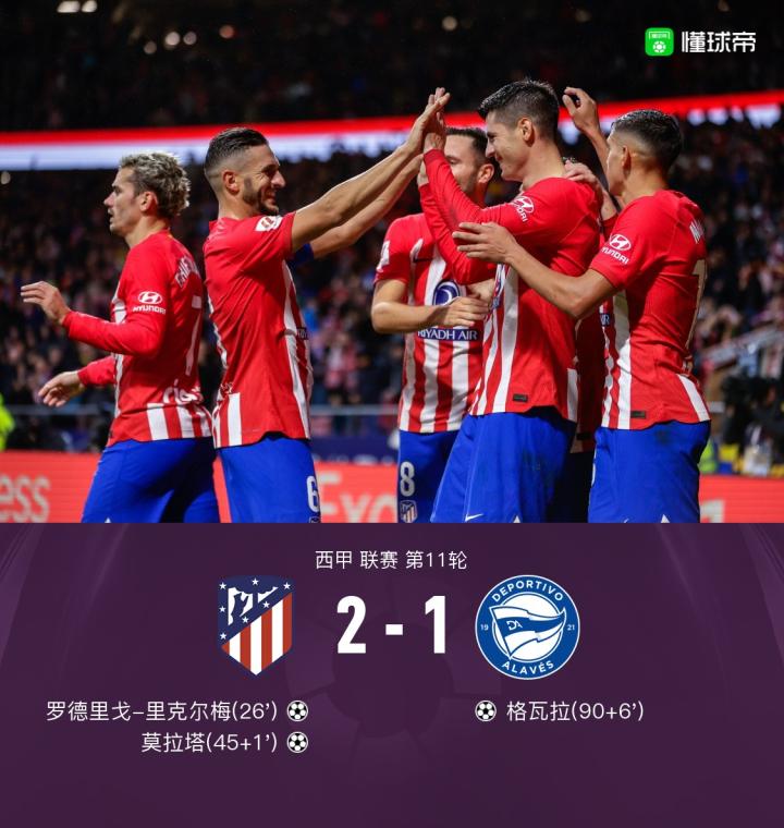 北京时间10月30日西甲 联赛 第11轮,马德里竞技主场对阵阿拉维斯。上半场埃尔莫索头球顶偏,里克尔梅捅射破门,莫拉塔禁区右路抽射得分,下半场科雷亚进球被吹惹争议,里克尔梅打门被扑,格瓦拉补时扳回一球,最终马竞2-1战胜阿拉维斯。