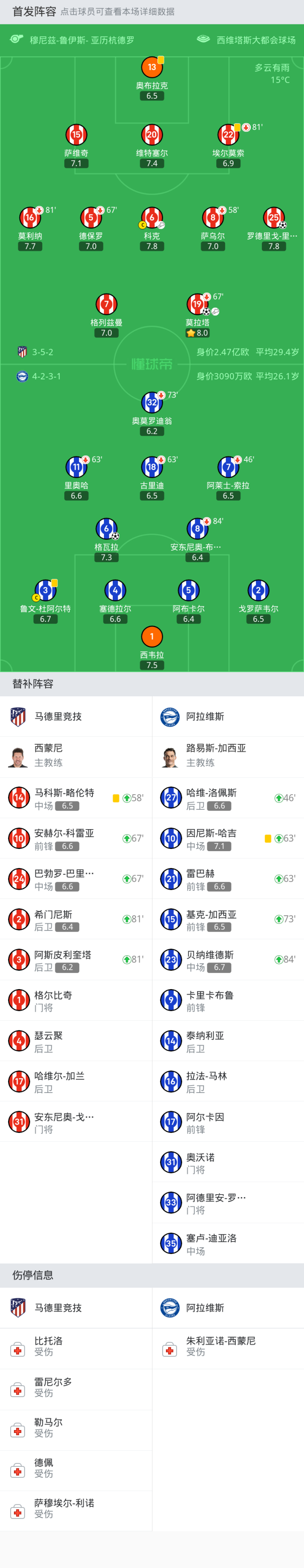 马德里竞技首发:20-维特塞尔, 13-奥布拉克, 15-萨维奇, 7-格列兹曼, 19-莫拉塔, 8-萨乌尔, 6-科克, 5-德保罗, 22-埃尔莫索, 16-莫利纳, 25-罗德里戈-里克尔梅
