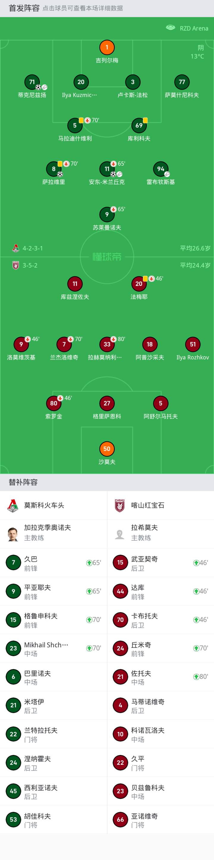 上场替补:65'7-久巴, 70'15-格鲁申科夫, 65'9-平亚耶夫, 70'23-Mikhail Shchetinin