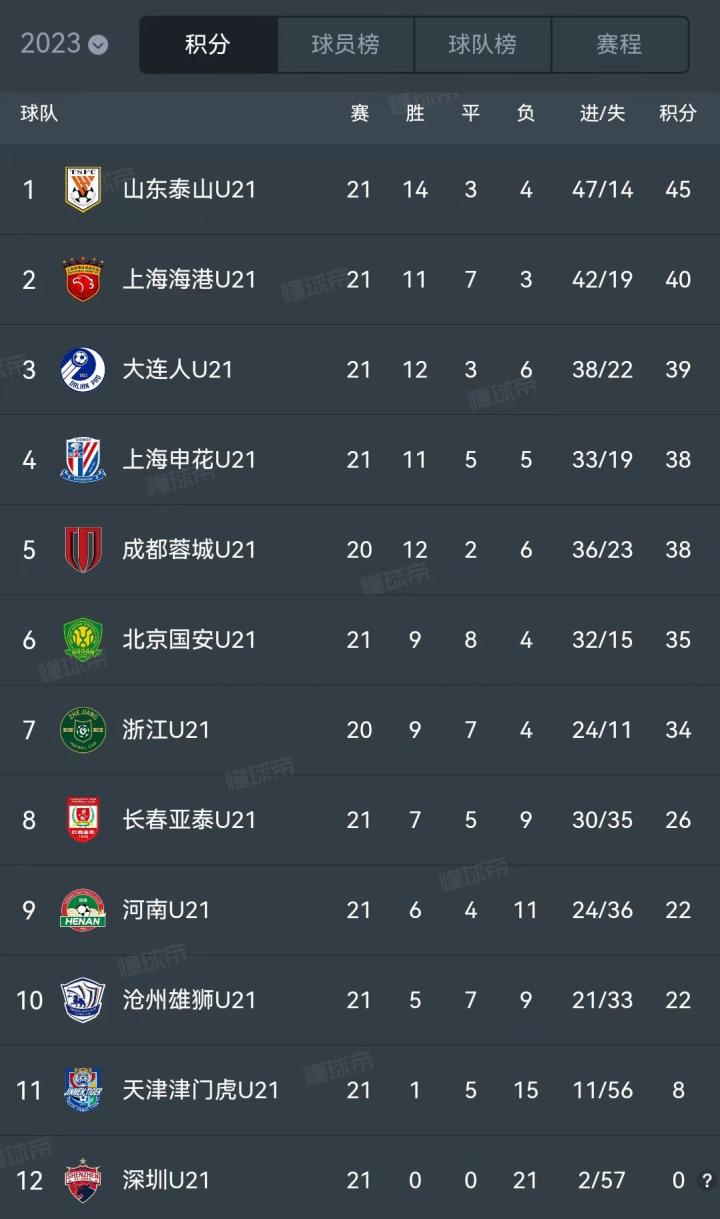 在还剩一轮的情况下,山东泰山U21已经拿到45个积分,身后的海港和大连人的积分分别为40分和39分,少赛一场的成都蓉城为38分。因此,山东泰山U21已经提前一轮夺得本赛季U21联赛冠军并获得下赛季中乙参赛资格。